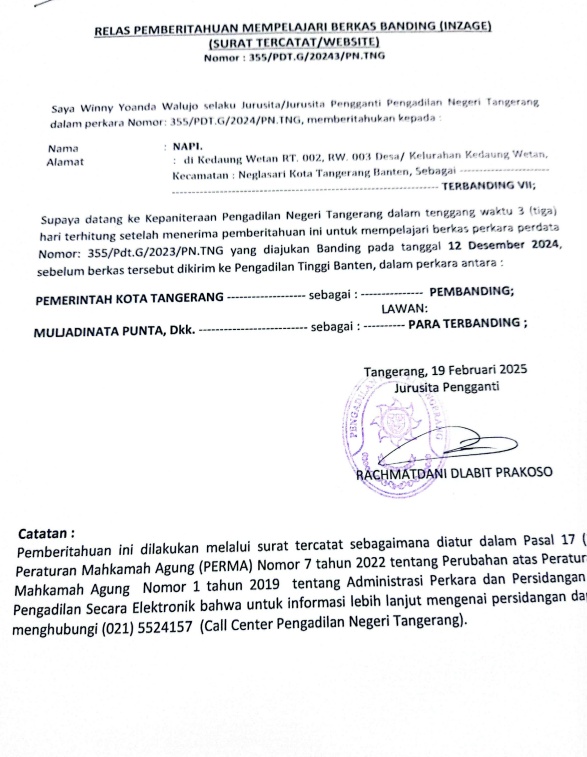 RELAAS PEMBERITAHUAN MEMPELAJARI BERKAS BANDING No. 355/Pdt.G/2024/PN Tng (An. NAPI)