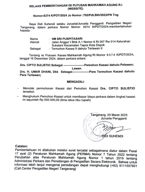 RELAAS PEMBERITAHUAN ISI PUTUSAN MA No. 6374 K/PDT/2024/2024 Jo No. 792/Pdt.Bth/2022/PN Tng (An. IIM SRI PUSPITASARI)