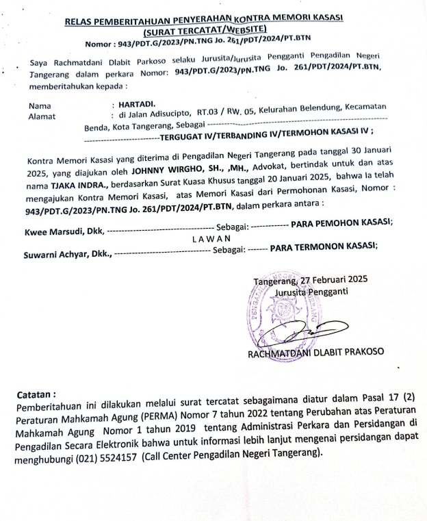 RELAAS PEMBERITAHUAN PENYERAHAN KONTRA MEMORI KASASI No. 943/Pdt.G/2023/PN Tng Jo No. 261/PDT/2024/PT BTN (An. HARTADI)