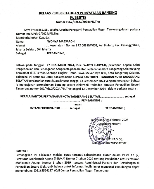 RELAAS PEMBERITAHUAN PERNYATAAN BANDING No. 967/Pdt.G/2024/PN Tng (An. NYONYA MAESAROH)