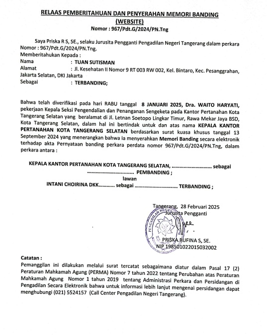 RELAAS PEMBERITAHUAN DAN PENYERAHAN MEMORI BANDING No. 867/Pdt.G/2024/PN Tng (An. TUAN SUTISMAN)