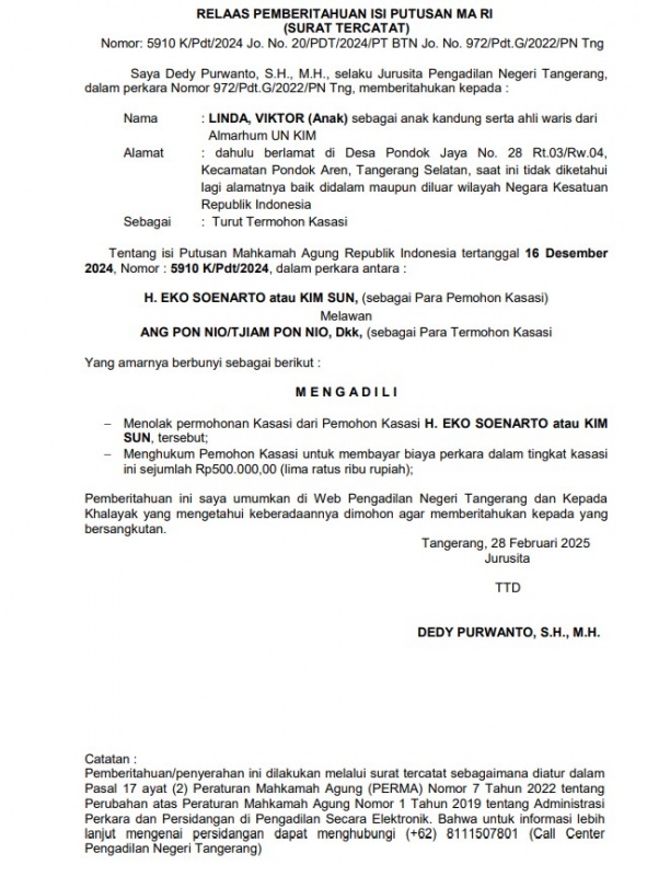 RELAAS PEMBERITAHUAN ISI PUTUSAN MA RI (SURAT TERCATAT) Nomor: 5910 K/Pdt/2024 Jo. No. 20/PDT/2024/PT BTN Jo. No. 972/Pdt.G/2022/PN Tng