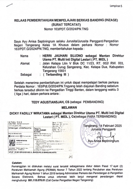 RELAAS PEMBERITAHUAN MEMPELAJARI BERKAS BANDING (INZAGE) No. 163/Pdt.G/2024/PN Tng (An. Herri Jauhari Sujono)