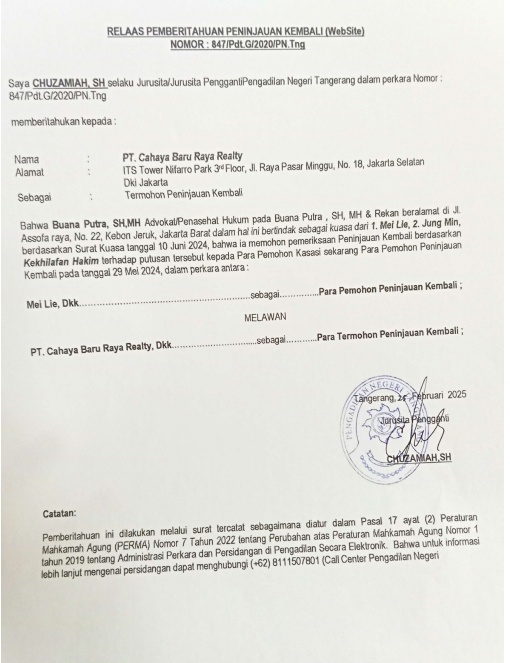 RELAAS PEMBERITAHUAN PK NO. 847/Pdt.G/2020'/PN Tng (An. PT.CAHAYA BARU RAYA REALTY)