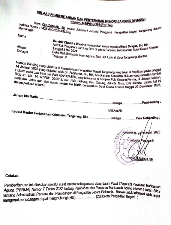 RELAAS PEMBERITAHUAN DAN PENYERAHAN MEMORI BANDING No. 342/Pdt.G/2024/PN Tng (An. HENDRI CHANDRA WIRATNO)