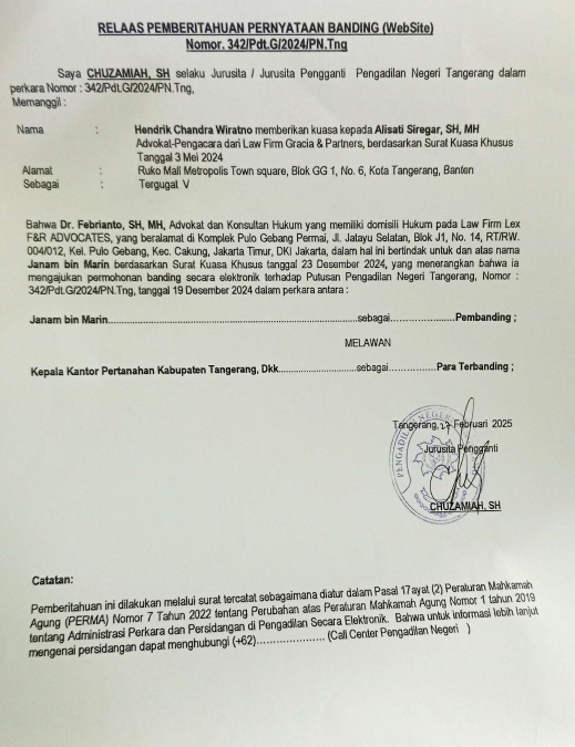 RELAAS PEMBERITAHUAN PERNYATAAN BANDING No. 342/Pdt.G/2024/PN Tng ((An. HENDRI CHANDRA WIRATNO).