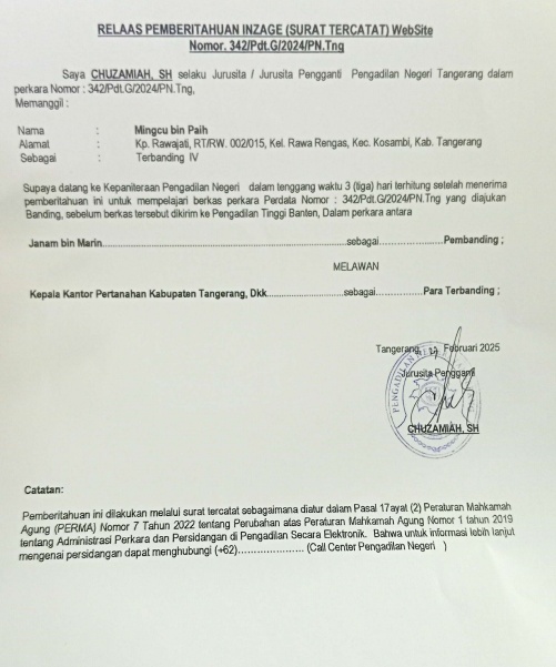 RELAAS PEMBERITAHUAN INZAGE NO. 342/Pdt.G/2024/PN Tng (An. MINGCU BIN PAIH)