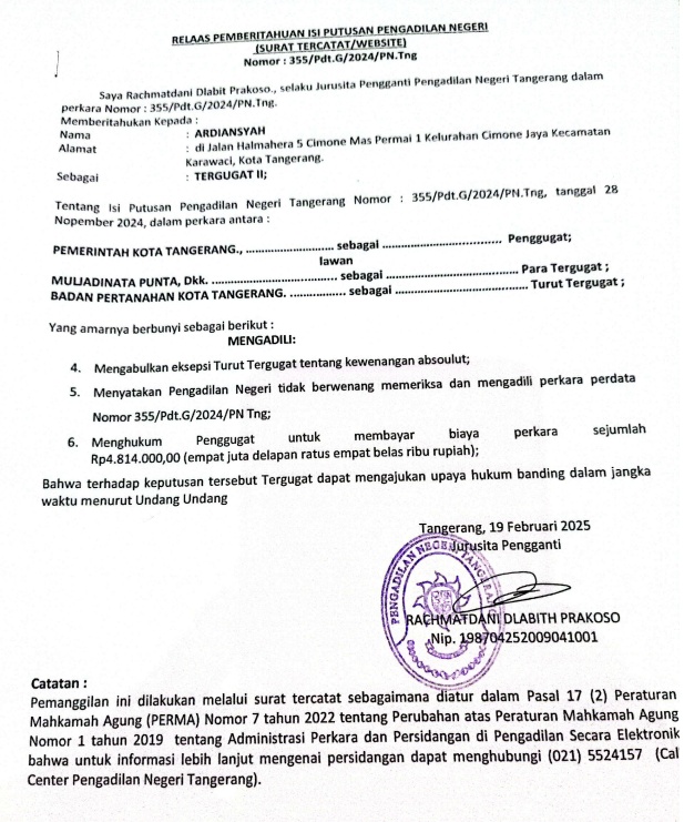 RELAS PEMBERITAHUAN ISI PUTUSAN PENGADILAN NEGERI NO. 355/Pdt.G/2024/PN Tng (An. ARDIANSYAH)