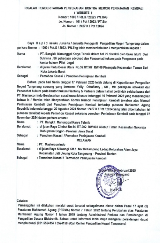 RISALAH PEMBERITAHUAN PENYERAHAN KONTRA MEMORI PK NO. 100/Pdt.G/2022/PN Tng Jo No. 161/PDT/2023/PT BTN Jo No. 2427 K /PDT/2024 (An. PT Bangkit Manunggal karya Teknik diwakili oleh Saka Murti Dwi)