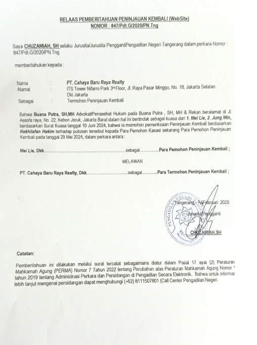 RELAAS PEMBERITAHUAN PENINJAUAN KEMBALI NO. 847/Pdt.G/2020/PN Tng (An. PT. CAHAYA BARU RAYA REALTY)
