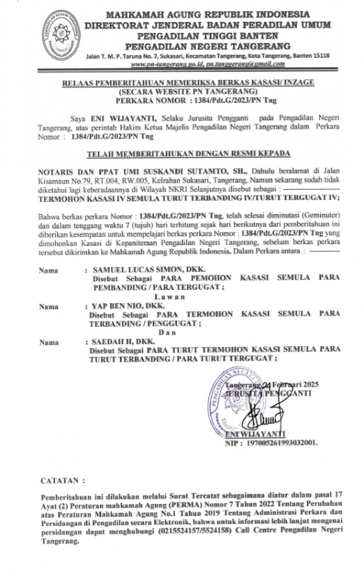 RELAAS PEMBERITAHUAN MEMERIKSA BERKAS KASASI/INZAGE (SECARA WEBSITE PN TANGERANG) NO: 1384/PDT.G/2023/PN TNG KEPADA TERMOHON KASASI IV / TURUT TERBANDING IV / TURUT TERGUGAT IV