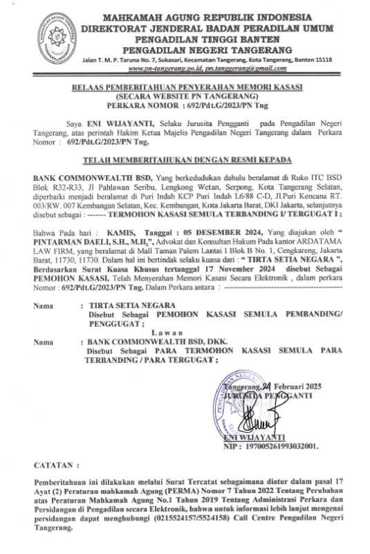 RELAAS PEMBERITAHUAN PENYERAHAN MEMORI KASASI (SECARA WEBSITE PN TANGERANG) NO: 692/PDT.G/2023/PN TNG KEPADA TERMOHON KASASI / TERBANDING I / TERGUGAT I