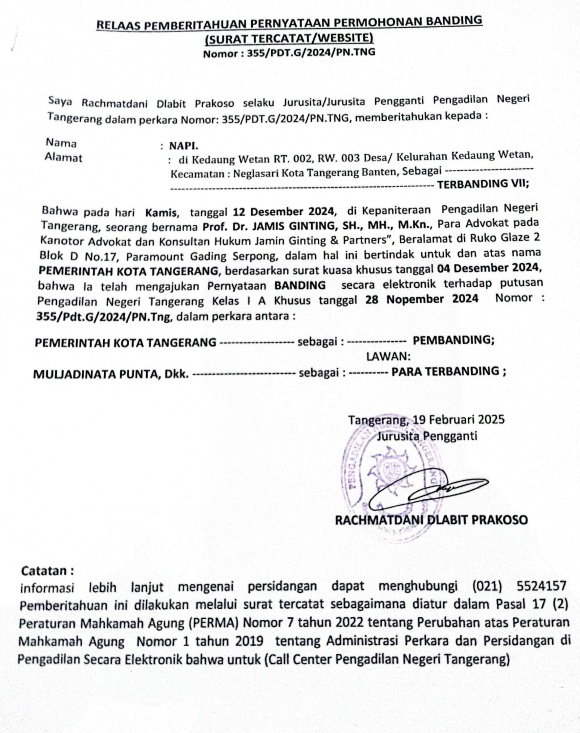 RELAAS PEMBERITAHUAN PERNYATAAN PERMOHONAN BANDING NO. 355/PDT.G.2024/PN TNG (An. NAPI)