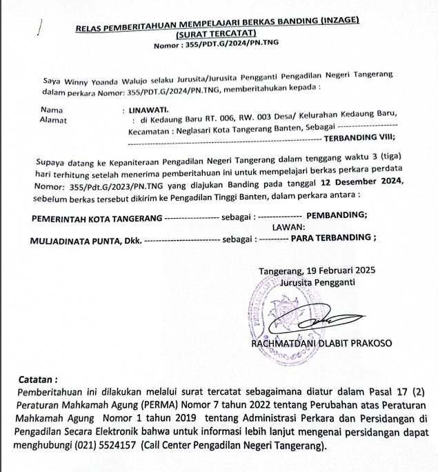 RELAS PEMBERITAHUAN MEMPELAJARI BERKAS BANDING (INZAGE) NO. 355/PDT.G/2024/PN TNG (An.LINAWATI)