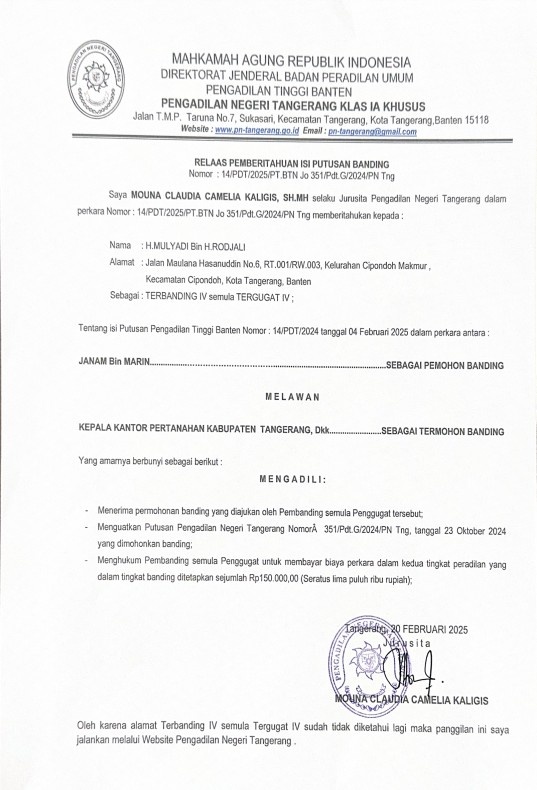 RELAAS PEMBERITAHUAN ISI PUTUSAN BANDING NOMOR 14/PDT/2025/PT BTN Jo. 351/Pdt.G/2024/PN Tng