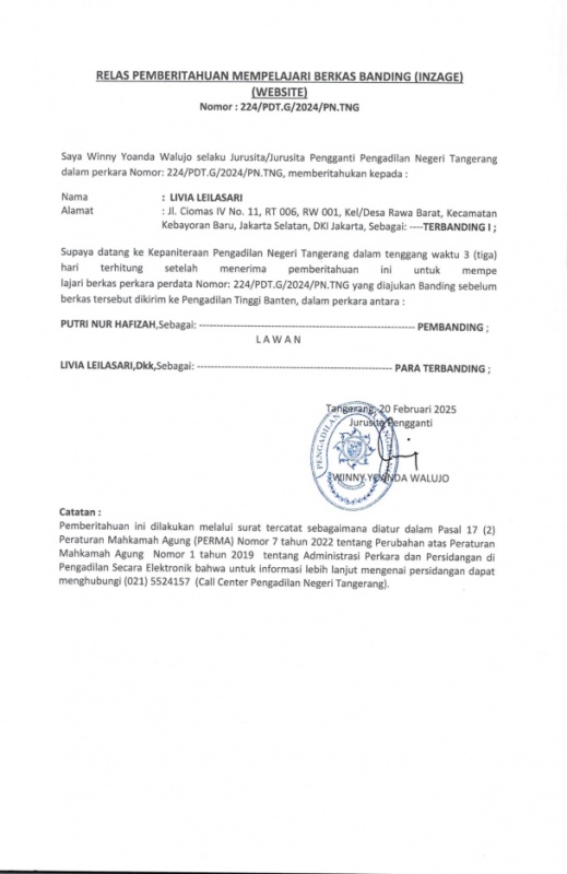 RELAAS PEMBERITAHUAN INZAGE BANDING NO. 224/Pdt.G/2024/PN Tng An. LIVIA LEILASARI