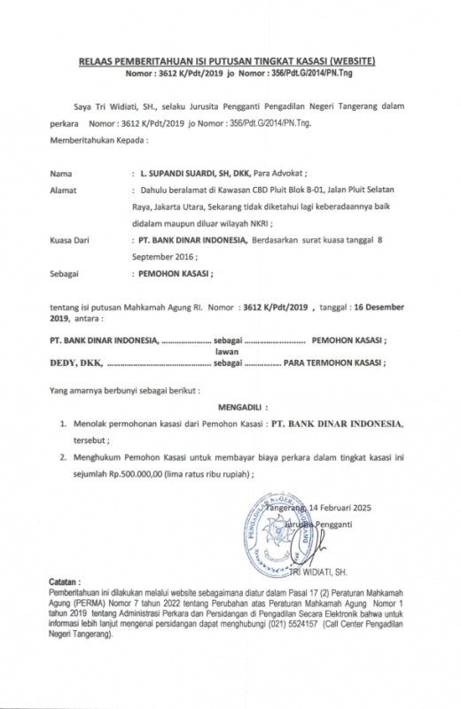 RELAAS PEMBERITAHUAN ISI PUTUSAN KASASI Nomor : 356/Pdt.G/2014/PN.Tng (WEBSITE An. PT BANK DINAR)
