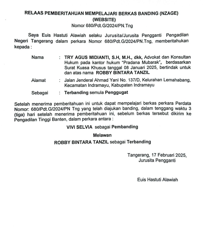 RELAAS PEMBERITAHUAN MEMPELAJARI BERKAS BANDING NOMOR 680/Pdt.G/2024/PN Tng