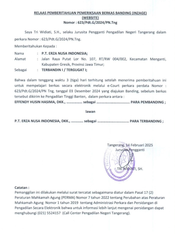 RELAAS PEMBERITAHUAN PEMERIKSAAN BERKAS BANDING (INZAGE) NO. 623/Pdt.G/2024/PN Tng KEPADA TERBANDING I / TERGUGAT I