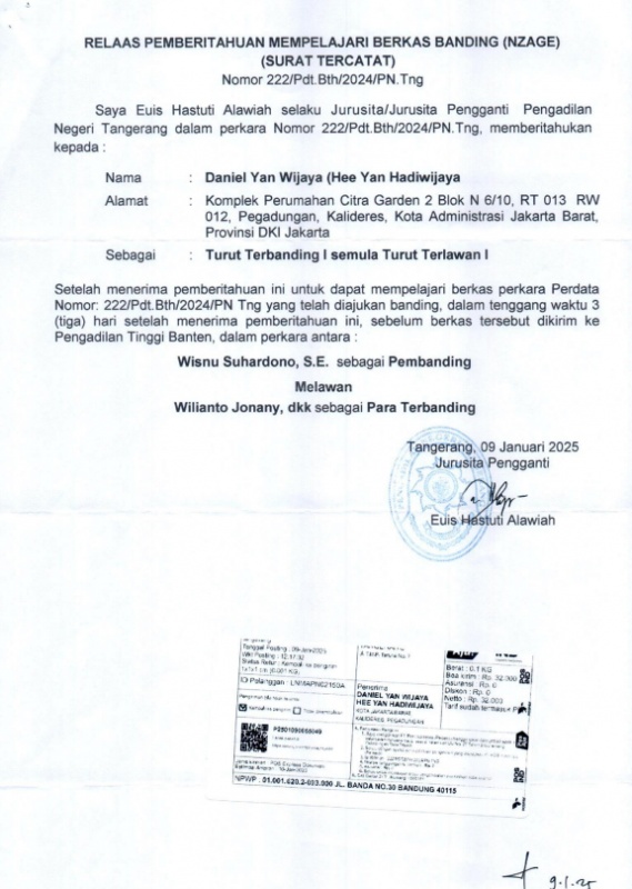 RELAAS PEMBERITAHUAN MEMPELAJARI BERKAS BANDING (INZAGE) TURUT TERBANDING I SEMULA TURUT TERLAWAN I NO. 222/Pdt.Bth/2024/PN Tng