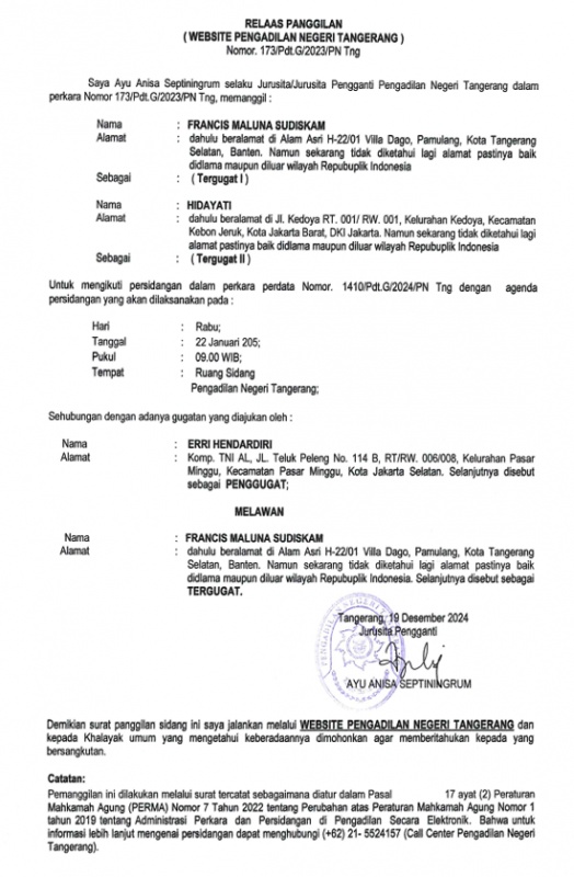 RELAAS PANGGILAN KEPADA TERGUGAT I DAN TERGUGAT II NO. 173/Pdt.G/2023/PN Tng