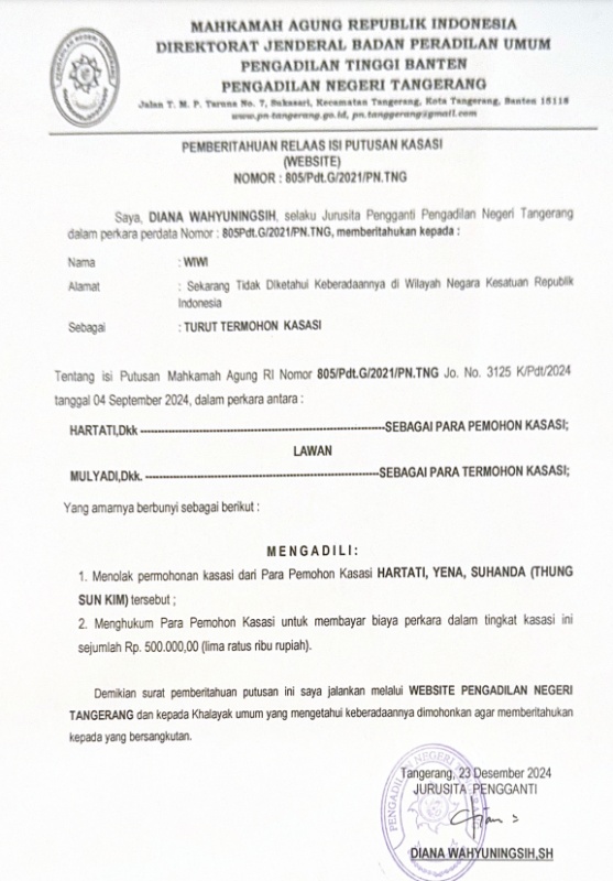 PEMBERITAHUAN RELAAS ISI PUTUSAN KASASI KEPADA TURUT TERMOHON KASASI NO. 805/Pdt.G/2021/PN Tng