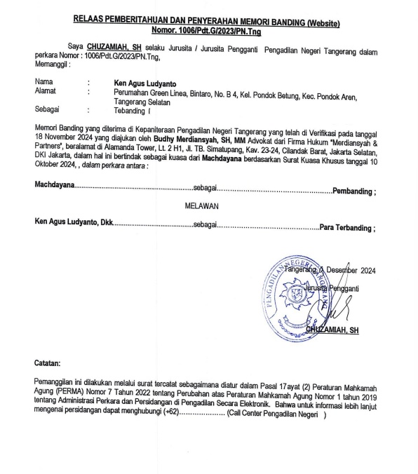 RELAAS PEMBERITAHUAN DAN PENYERAHAN MEMORI BANDING KEPADA TERBANDING I NO. 1006/Pdt.G/.2023/PN Tng
