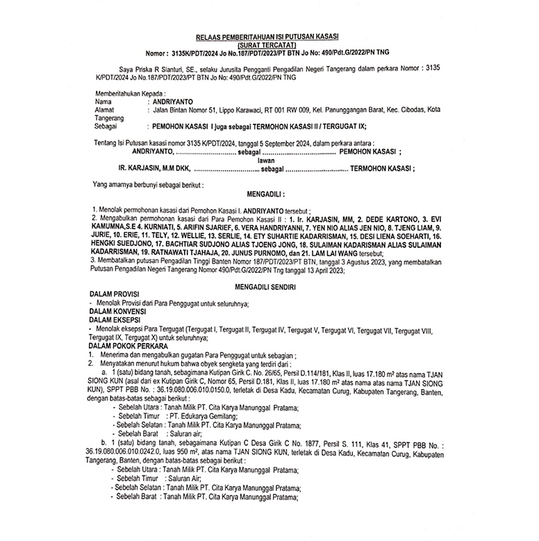 RELAAS PEMBERITAHUAN ISI PUTUSAN KASASI NOMOR 3135K/PDT/2024 Jo. NOMOR 187/PDT/2023/PT BTN Jo. NOMOR 490/PDT.G/2022/PN TNG