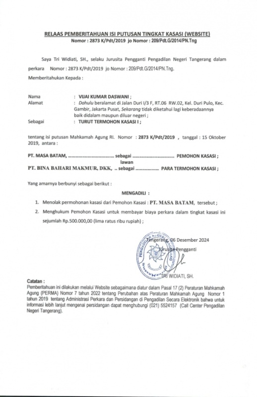 RELAAS PEMBERITAHUAN ISI PUTUSAN KASASI Nomor : 209/Pdt.G/2014/PN.Tng (an. VIJAY KUMAR)