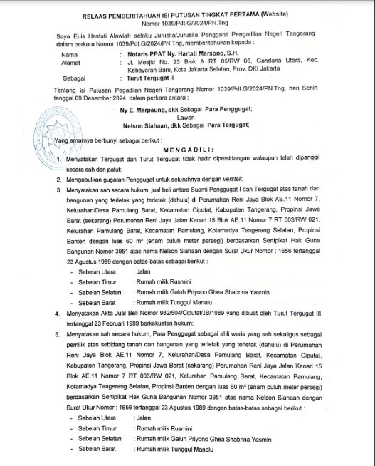 RELAAS PEMBERITAHUAN ISI PUTUSAN TINGKAT PERTAMA 1039/Pdt.G/2024/PN Tng