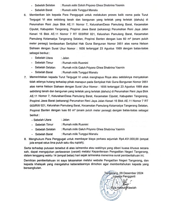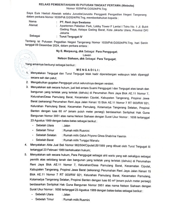RELAAS PEMBERITAHUAN PUTUSAN TINGKAT PERTAMA NOMOR 1039/Pdt.G/2024/PN Tng