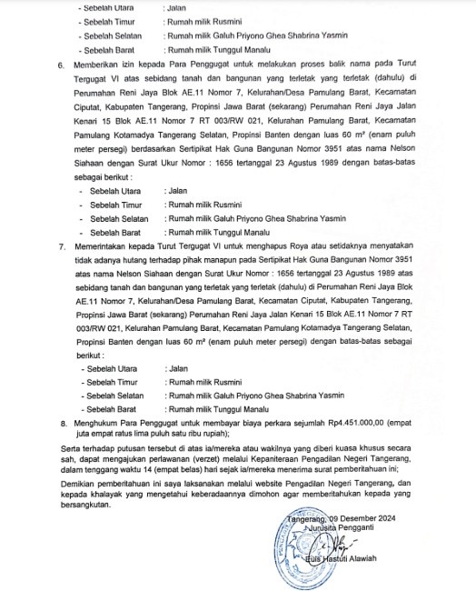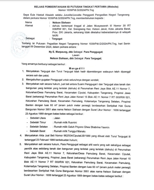 RELAAS PEMBERITAHUAN ISI PUTUSAN TINGKAT PERTAMA NOMOR 1039/Pdt.G/2024/PN Tng