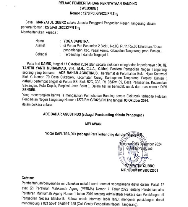RELAAS PEMBERITAHUAN MEMPELAJARI BERKAS (INZAGE) BANDING NOMOR 1270/Pdt.G/2023/PN Tng