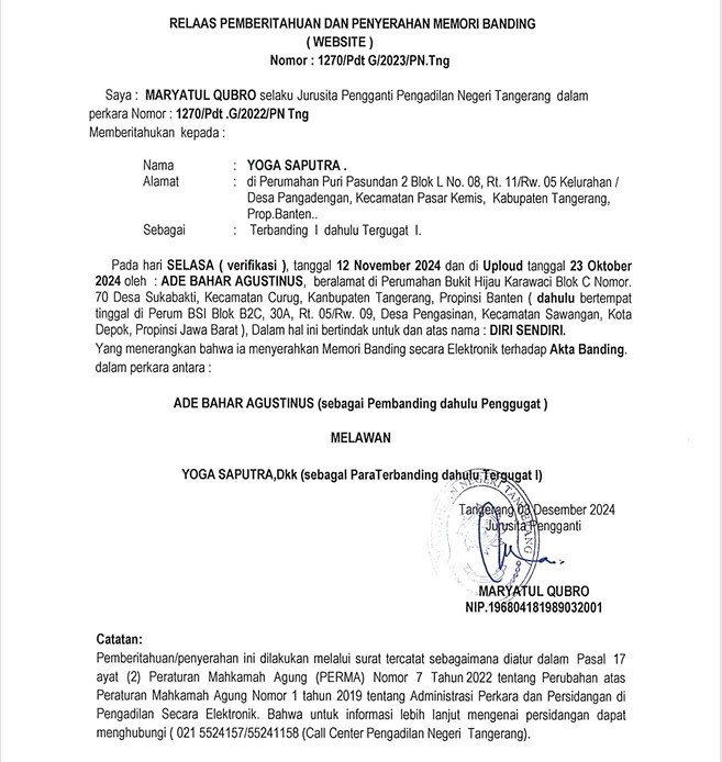 RELAAS PEMBERITAHUAN DAN PENYERAHAN MEMORI BANDING NOMOR 1270/Pdt.G/2023/PN Tng