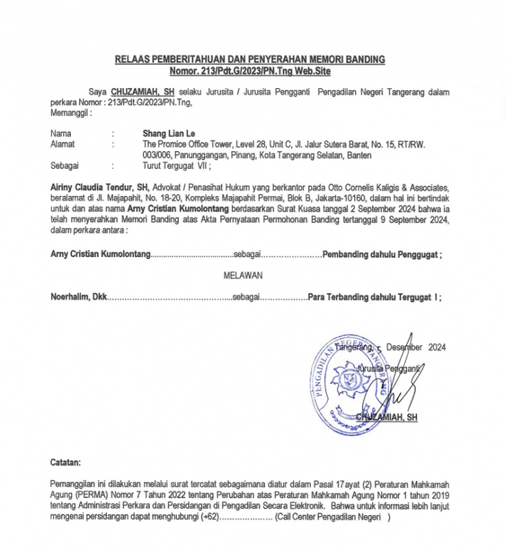 RELAAS PEMBERITAHUAN DAN PENYERAHAN MEMORI BANDING KEPADA TURUT TERBANDING VII NOMOR 213 PDT.G 2023 PN TNG