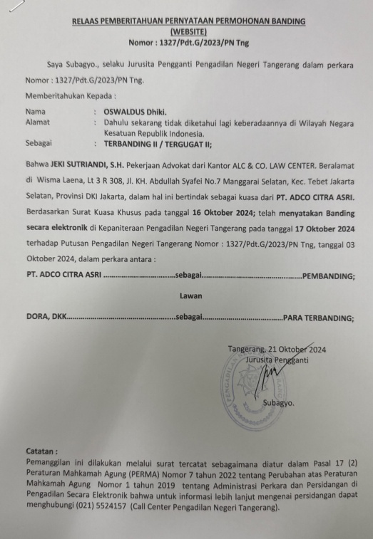 RELAAS PEMBERITAHUAN PERNYATAAN PERMOHONAN BANDING KEPADA TERBANDING II / TERGUGAT II NO. 1327/Pdt.G/2023/PN Tng