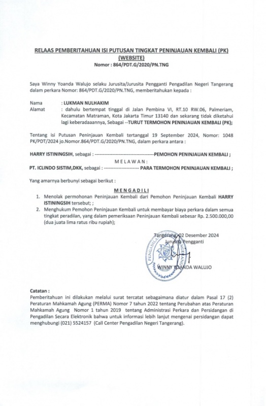 Relaas Pemberitahuan Isi Putusan PK No. 864/Pdt.G/2020 Turut Termohon An.LUKMAN