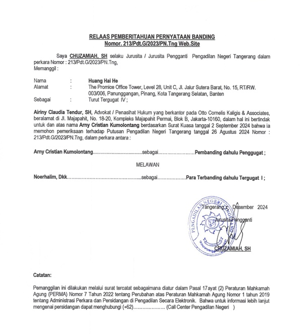 RELAAS PEMBERITAHUAN PERNYATAAN BANDING KEPADA TURUT TERBANDING IV NOMOR 213/PDT.G/2023/PN TNG