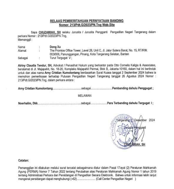RELAAS PEMBERITAHUAN PERNYATAAN BANDING KEPADA TURUT TERBANDING V NOMOR 213/PDT.G/2023/PN TNG