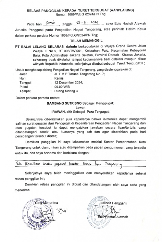 RELAAS PANGGILAN KEPADA TURUT TERGUGAT NO. 1069/Pdt.G/2024/PN Tng