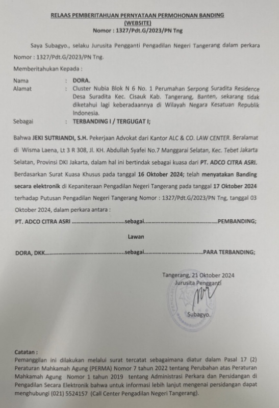 RELAAS PEMBERITAHUAN PERNYATAAN PERMOHONAN BANDING KEPADA TERBANDING I / TERGUGAT I NO. 1327/Pdt.G/2023/PN Tng