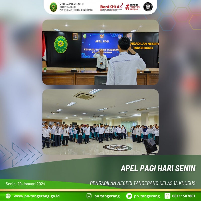 Apel pagi dilaksanakan pada Senin, 29 Januari 2024, Pukul 08.00 WIB, di Ruang Aula Lantai 5. Peserta apel pagi ini diikuti oleh Wakil Ketua, Bapak/Ibu Hakim, Panitera, Sekretaris, para pejabat Struktural/Fungsional, serta diikuti oleh seluruh Karyawan/Karyawati ASN, Tenaga Honor dan Tenaga Kerja Kontrak pada Pengadilan Negeri Tangerang.