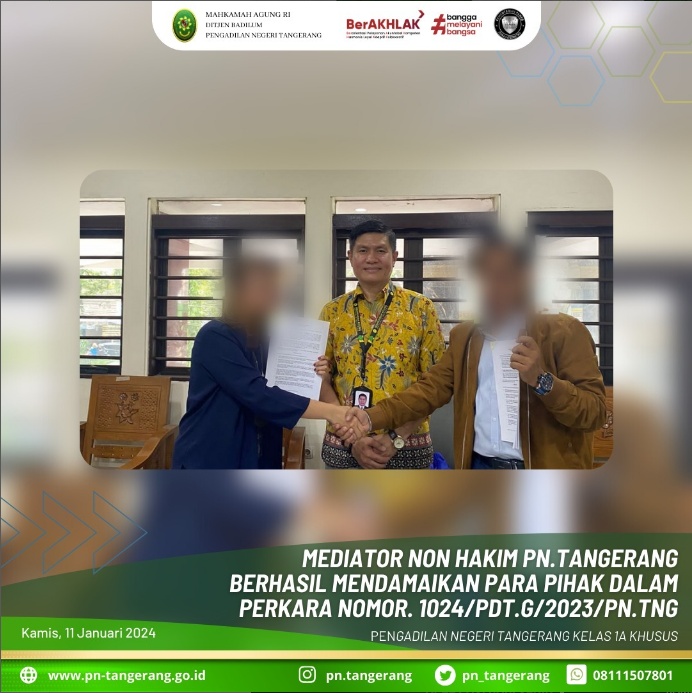 Mediasi adalah salah satu bentuk alternatif penyelesaian sengketa yang diatur dalam Perma No. 1 Tahun 2016 tentang Prosedur Mediasi di Pengadilan. Pada hari, Kamis (11/01/2024) adalah hari yang berbahagia untuk Penggugat dan Tergugat dalam perkara nomor 1024/Pdt.G/2023/PN.Tng dalam gugatannya, dapat berakhir dan berhasil damai dengan menempuh beberapa kali agenda Mediasi di Pengadilan Negeri Tangerang, yang dibantu dirumuskan oleh Mediator Non-Hakim PN Tangerang, Bapak Semmy Arter Mantouw, S.H., M.M., M.H.