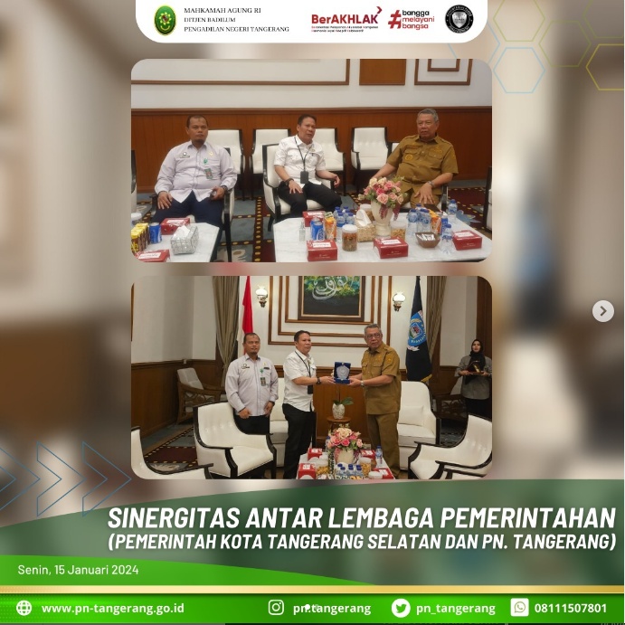 Ketua Pengadilan Negeri iconwin Tangerang, melakukan kunjungan ke Walikota Tangerang Selatan, tanggal 15 Januari 2024, bertempat di rumah Dinas Walikota Tangerang Selatan. Dalam kunjungan tersebut Ketua didampingi oleh Sekretaris Pengadilan Negeri Tangerang Bapak H. Zulfikar Arif Rahman Purba, S.H., M.M.