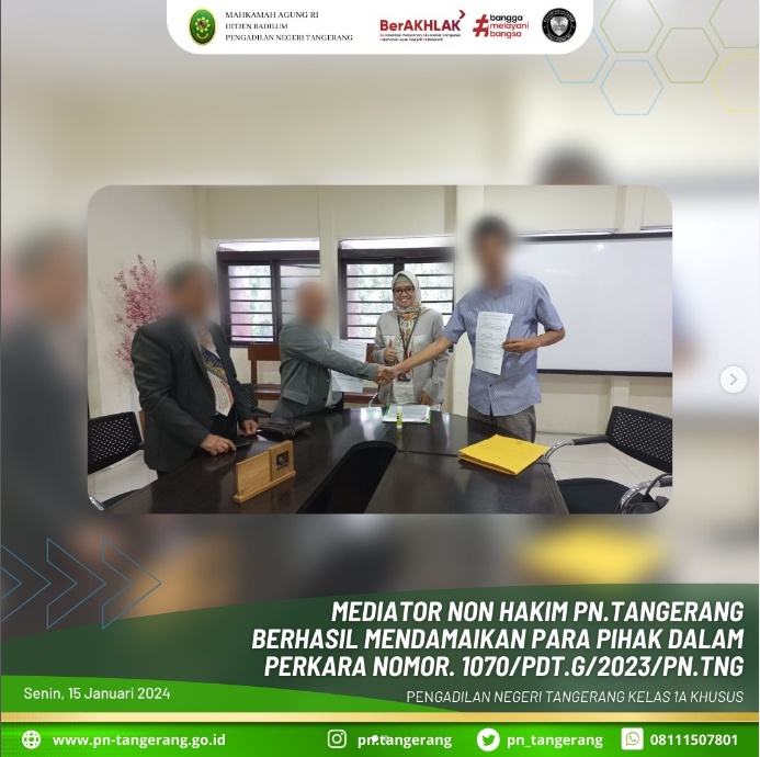 Pada hari, Senin (15/01/2024) adalah hari yang berbahagia untuk Penggugat dan Tergugat dalam perkara nomor 1070/Pdt.G/2023/PN.Tng dalam gugatan melawan hukum, dapat berakhir dan berhasil damai dengan menempuh beberap kali agenda Mediasi di Pengadilan Negeri Tangerang, yang dibantu dirumuskan oleh Mediator Non-Hakim PN Tangerang, Ibu Andi Masniar, SH., MM., C.Med. dan perkara Nomor. 1027.Pdt.G/2023/PN.TNG dalam gugatan melawan hukum, dapat berakhir dan berhasil damai dengan menempuh beberap kali agenda Mediasi di Pengadilan Negeri Tangerang, yang dibantu dirumuskan oleh Mediator Non-Hakim PN Tangerang, Bapak Amal Jamaludin,SH.,CIL.,CPM.,CPL.
