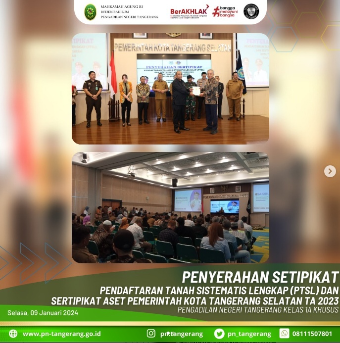 Berdasarkan Surat Undangan Kantor Pertahanan Kota Tangerang Selatan Nomor. 03/UND-36.73.UP.02.03/I/2024 tertanggal 05 Januari 2024 perihal Undangan Penyerahan Sertipikat, pada hari Rabu, 09 Januari 2024 pukul 08.00 WIB s/d selesai di Ruang Blandongan, Kantor Pemerintahan Kota Tangerang Selatan. Dalam kegiatan ini, Hakim Pengadilan Negeri Tangerang, Bapak. Wadji Pramono, S.H., M.H., menghadiri acara tersebut mewakili Ketua Pengadilan Negeri Tangerang yang berhalangan hadir dalam acara.