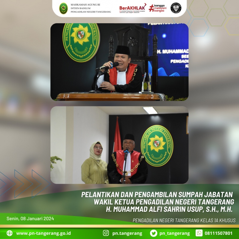 Berdasarkan Surat Ketua Pengadilan Negeri Nomor. 121/KPN.W29.U4/UND.OT1.6/1/2024 tertanggal 04 Januari 2024 diselenggarakan acara Pelantikan dan Pencambilan Sumpah Jabatan Wakil Ketua Pengadilan Negeri Tangerang yaitu Bapak H. Muhammad Alfi Sahrin Usup, S.H., M.H.