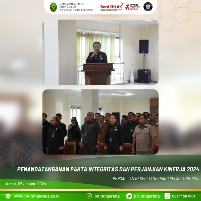 Diawal tahun 2024 ini, pada hari Selasa 09 Januari 2024 Pukul 09.30 WIB s/d 10.15 bertempat diruang aula lantai 5 Pengadilan Negeri Tangerang, melaksanakan Penandatanganan Pakta Integritas dan perjanjian Kerja oleh Hakim, Panitera, Sekretaris, Pejabat Struktural, dan Fungsional, serta pegawai di Lingkungan Pengadilan Negeri Tangerang.