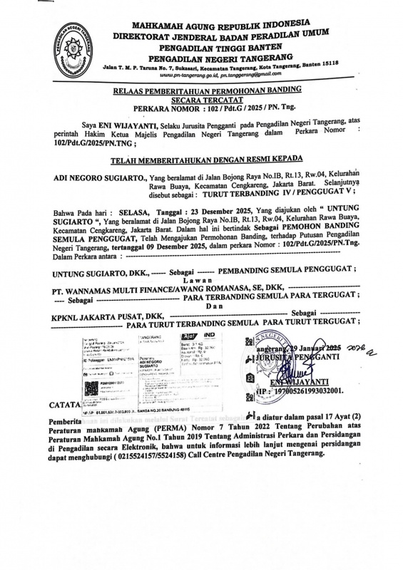 RELAAS PEMBERITAHUAN PERMOHONAN BANDING NOMOR 102/PDT.G/2025/PN.TNG (ADI NEGORO SUGIARTO)