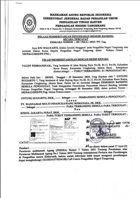 RELAAS PEMBERITAHUAN PENYERAHAN MEMORI BANDING PERKARA NOMOR : 102/PDT.G/2025/PN. TNG (VALEN FEBRIANSYAH)